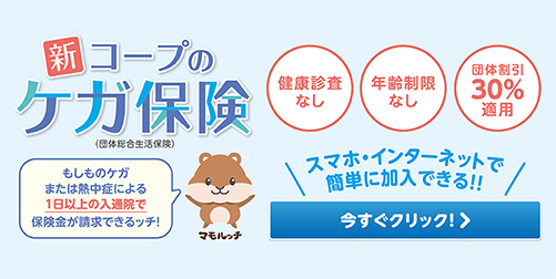 新コープのケガ保険です。全国の生協組合員の団体契約だから、保険料が割安です。